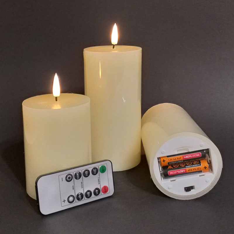 Набор из трех светодиодных свечей из натурального воска, с имитацией пламени 3D с пультом управления. Специальная конструкция фитиля создает эффект, подобный мерцанию настоящей свечи, видимый с любой точки.