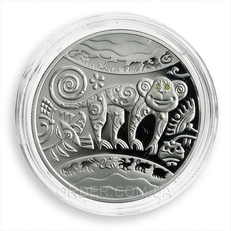 На монете в лубочном стиле изображена обезьяна, глаза которой украшены кубическими оксидами циркония желтого цвета (диаметр каждого кристалла - 1,25 мм.).