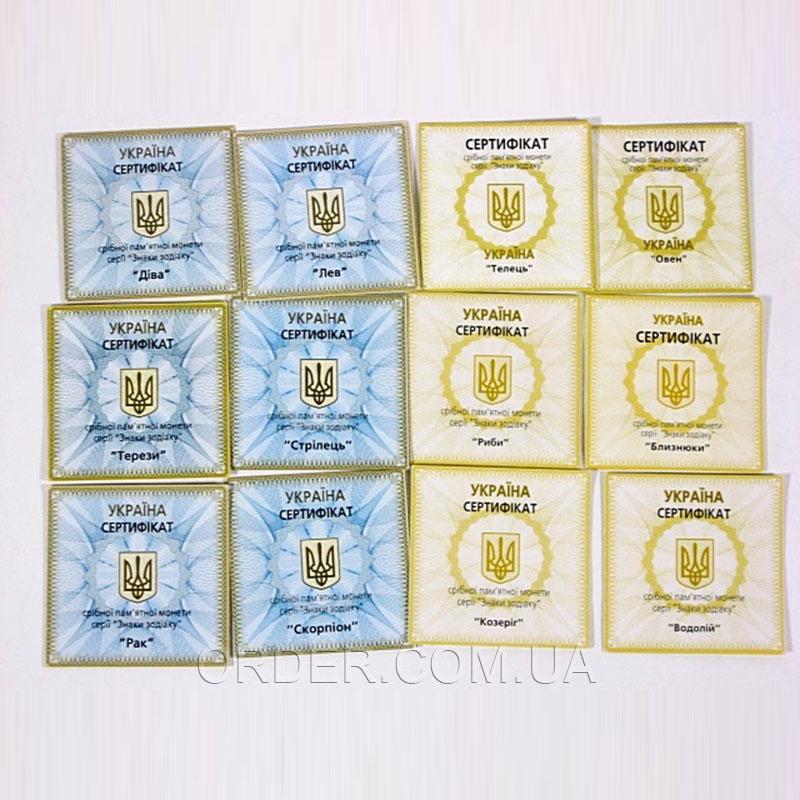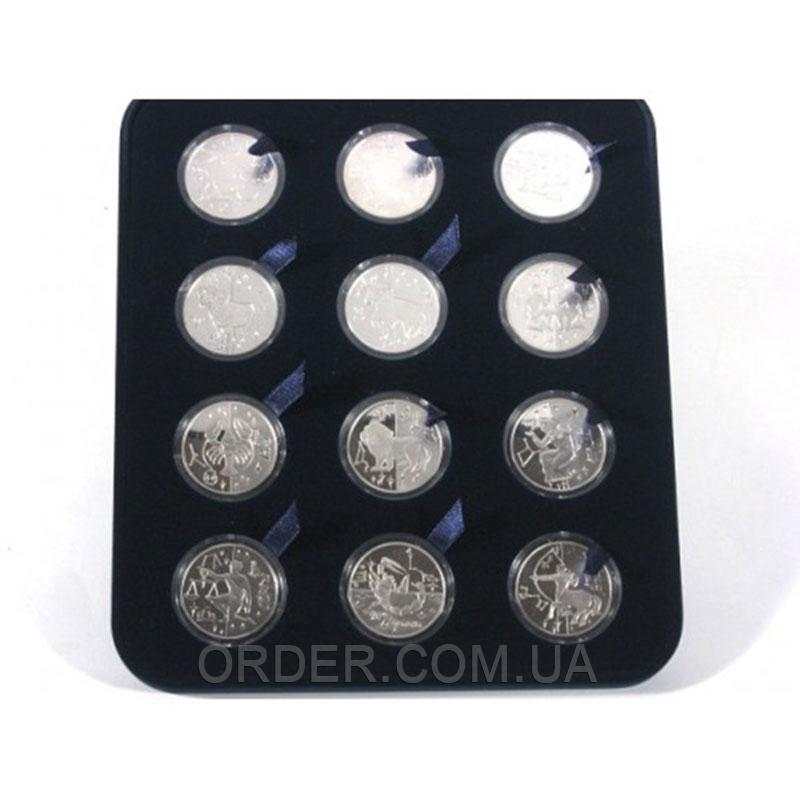Сувенирный набор из подарочных серебряных монет знаков зодиака (12 штук) изготовленных из серебра 925 пробы. На каждую серебряную монету предоставляется сертификат НБУ.
