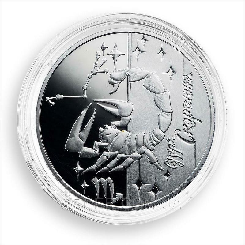 Серебряная монета 'Скорпион' - это памятная подарочная серебряная монета знака зодиака, выпущенная Национальным Банком Украины в рамках серии монет 'Знаки Зодиака'. Монета посвящена созвездию 'Скорпион'. К каждой серебряной монете прилагается сертификат НБУ, с описанием всех характеристик монеты.