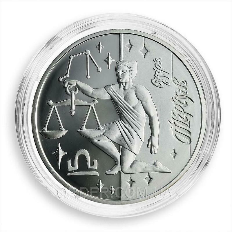 - На реверсе серебряной монеты размещено стилизованное изображение знака зодиака в окружении звезд, слева от которого - символ знака зодиака, справа - надпись 'Весы' .