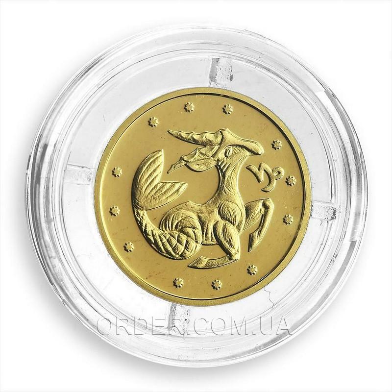 - На реверсе золотой монеты размещено стилизованное изображение знака зодиака 'Козерог' в окружении звезд, над которым - символ знака зодиака.