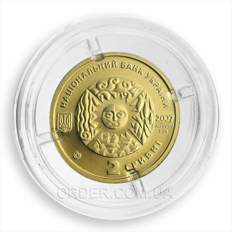 - В центре круга - стилизованное изображение солнца. Слева от круга - малый Государственный Герб Украины, справа - год чеканки монеты, обозначение металла, его пробы - Au 999,9, масса - 1,24;