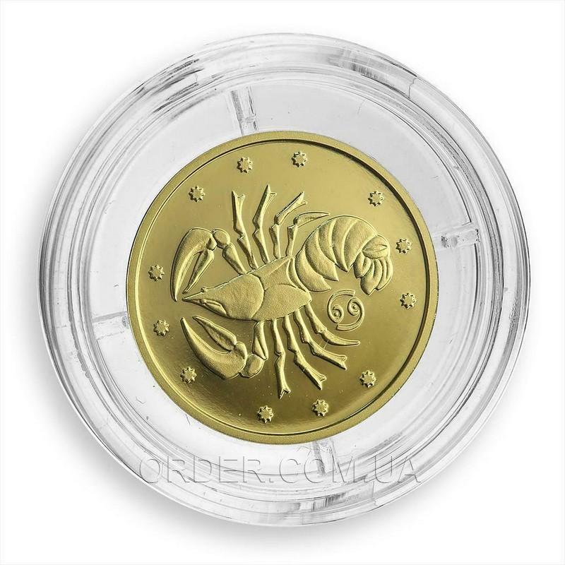- На реверсе золотой монеты размещено стилизованное изображение знака зодиака 'Рак' в окружении звезд, над которым - символ знака зодиака.