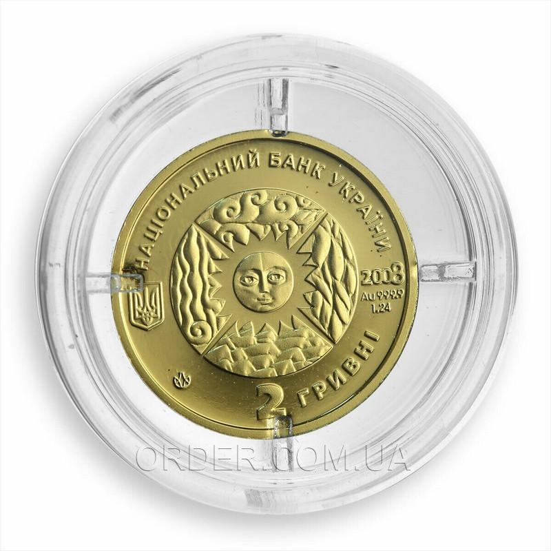 - В центре круга - стилизованное изображение солнца. Слева от круга - малый Государственный Герб Украины, справа - год чеканки монеты, обозначение металла, его пробы - Au 999,9, масса - 1,24;