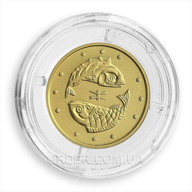 - На реверсе золотой монеты размещено стилизованное изображение знака зодиака 'Рыбы' в окружении звезд, над которым - символ знака зодиака.