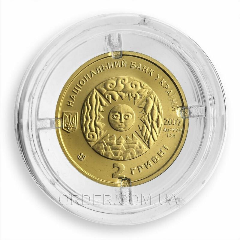 - В центре круга - стилизованное изображение солнца. Слева от круга - малый Государственный Герб Украины, справа - год чеканки монеты, обозначение металла, его пробы - Au 999,9, масса - 1,24;