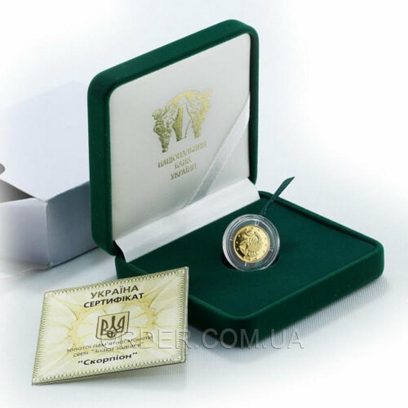 Золотая монета 'Скорпион' - это памятная подарочная золотая монета знака зодиака, выпущенная Национальным Банком Украины в рамках серии монет 'Знаки Зодиака'. Монета посвящена созвездию 'Скорпион'. К каждой золотой монете прилагается сертификат НБУ, с описанием всех характеристик монеты.