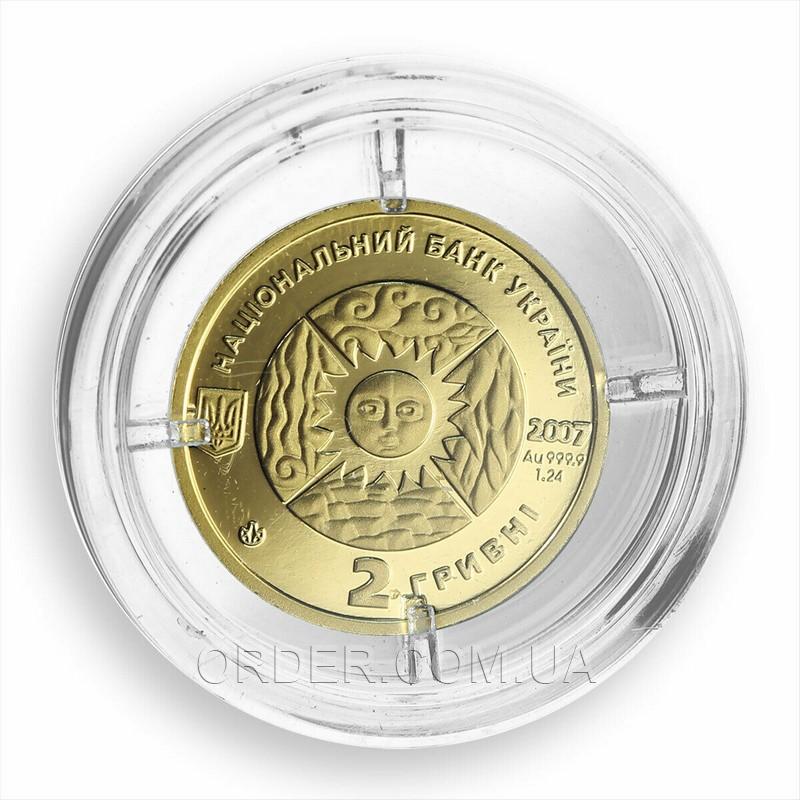 - В центре круга - стилизованное изображение солнца. Слева от круга - малый Государственный Герб Украины, справа - год чеканки монеты, обозначение металла, его пробы - Au 999,9, масса - 1,24;
