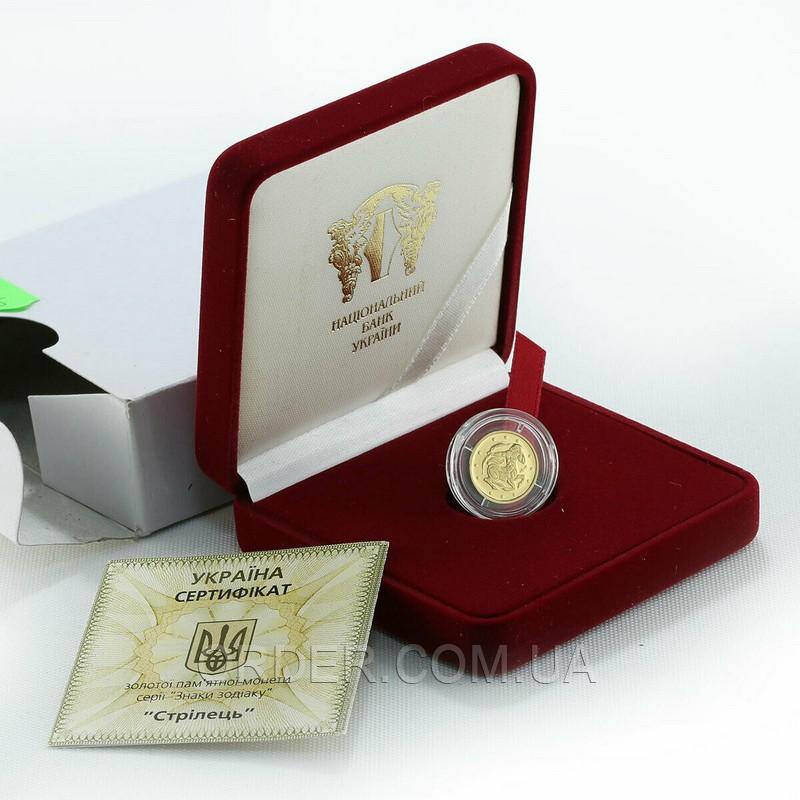 Золотая монета 'Стрелец' - это памятная подарочная золотая монета знака зодиака, выпущенная Национальным Банком Украины в рамках серии монет 'Знаки Зодиака'. Монета посвящена созвездию 'Стрелец'. К каждой золотой монете прилагается сертификат НБУ, с описанием всех характеристик монеты.