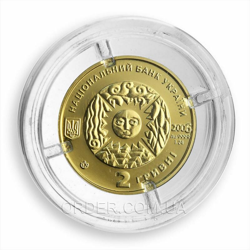 - В центре круга - стилизованное изображение солнца. Слева от круга - малый Государственный Герб Украины, справа - год чеканки монеты, обозначение металла, его пробы - Au 999,9, масса - 1,24;