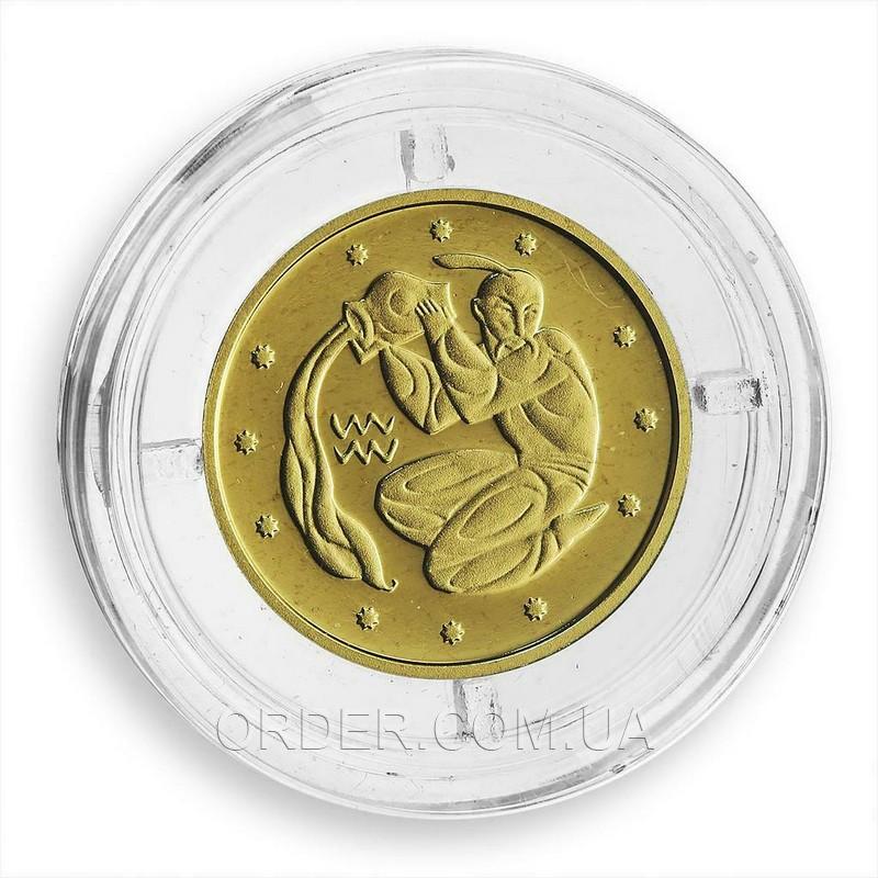 - На реверсе золотой монеты размещено стилизованное изображение знака зодиака 'Водолей' в окружении звезд, над которым - символ знака зодиака.